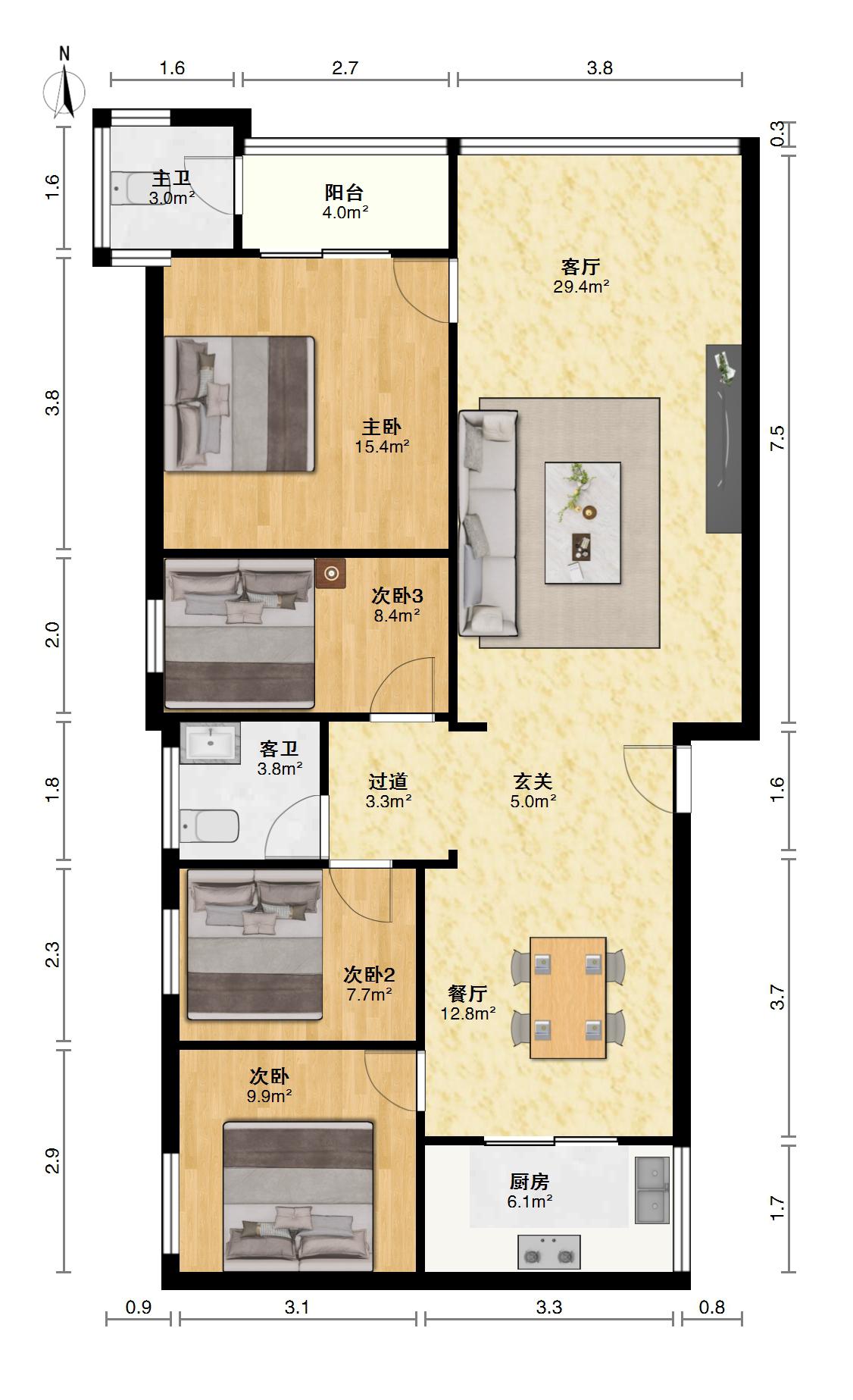 1、正规3室2厅1卫1阳台。.日照充足.