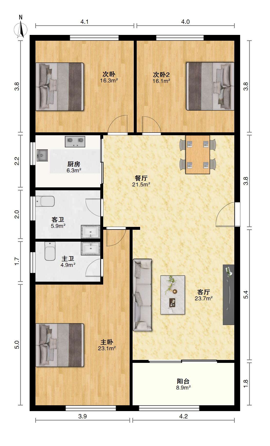 南北通透三房两卫户型,简单装修