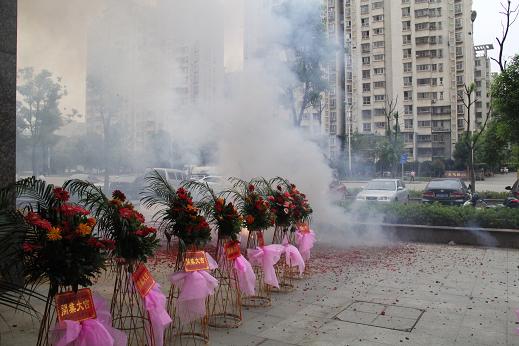 伙伴们送的花篮和爆竹声声