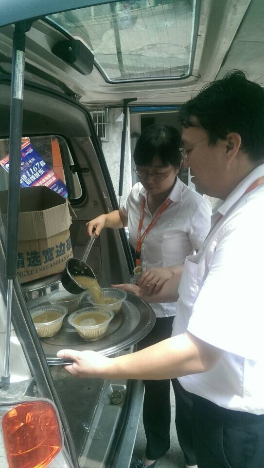 8月21号一大早,行政师傅就熬好了绿豆汤。随即,营销总监査流星和三大区经理黄国俊、二片区经理陈勇等各个片区经理一起前往三大片区门店,为奋斗在一线的鸿基伙伴们送去一份解暑的清凉。
