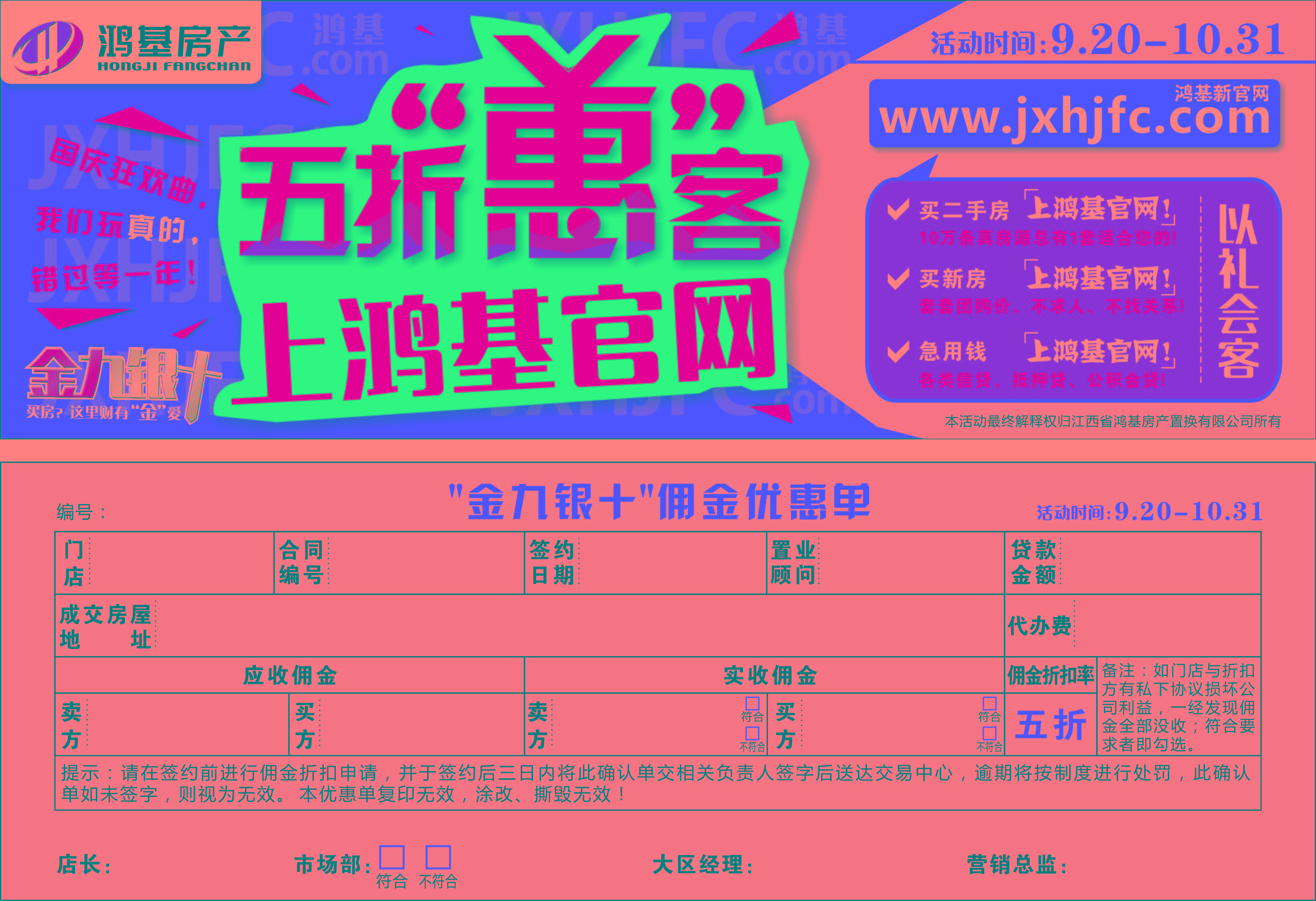 官网购房打5折——只要是活动期间第一时间在鸿基房产网登记了真实有效的出售及购房信息,并在活动期间成功交易的业主及客户就可享受佣金五折优惠。这是鸿基自2013年以来难遇的折扣力度,我们希望在国庆来临之际回馈所有支持我们的客户,以我们的让利成全客户开心置业。