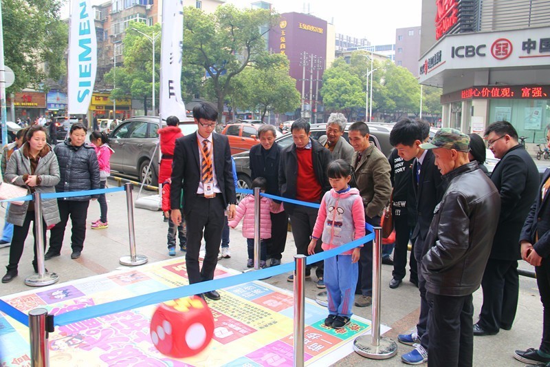几个小朋友抱着巨大的骰子在我们准备的互动大富翁游戏中玩的不亦乐乎,家长们也跃跃欲试。在游戏中收获丰厚礼品的朋友开心地与我们交易中心的伙伴合影。